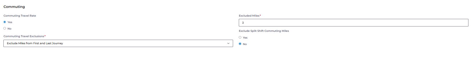 When Commuting Travel Rate = Yes the new field "Commuting Travel Exclusions" will control whether any mileage is excluded from commuting journeys - this will default to no exclusions and can be changed to the following options: