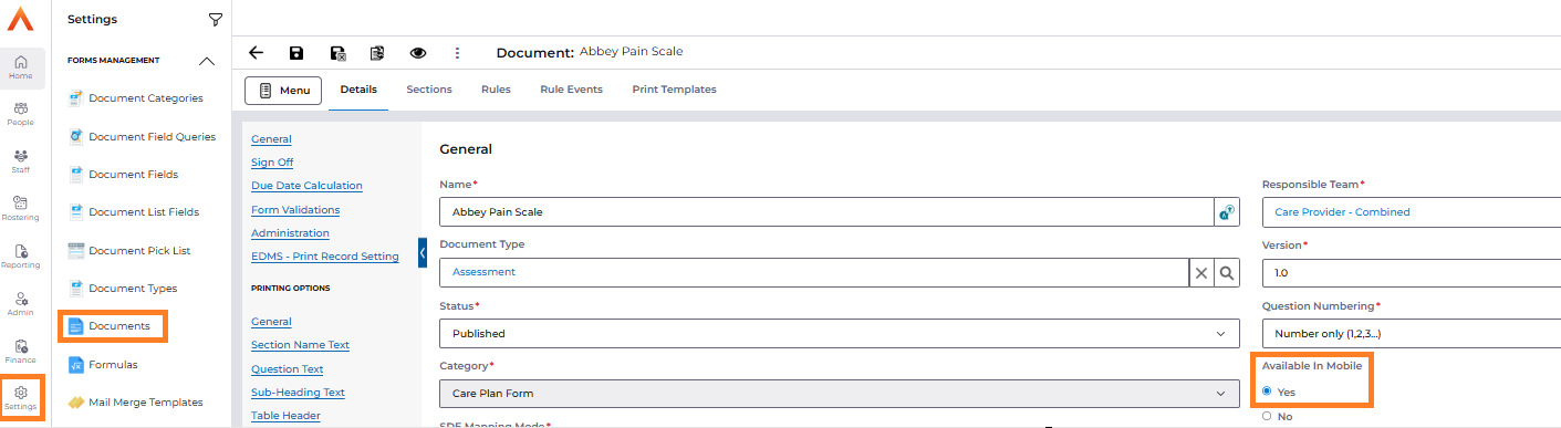 To make a Form available in the Mobile App go to Settings > Forms Management >Documents. Open the relevant Document and then set “Available In Mobile” to ‘Yes’.