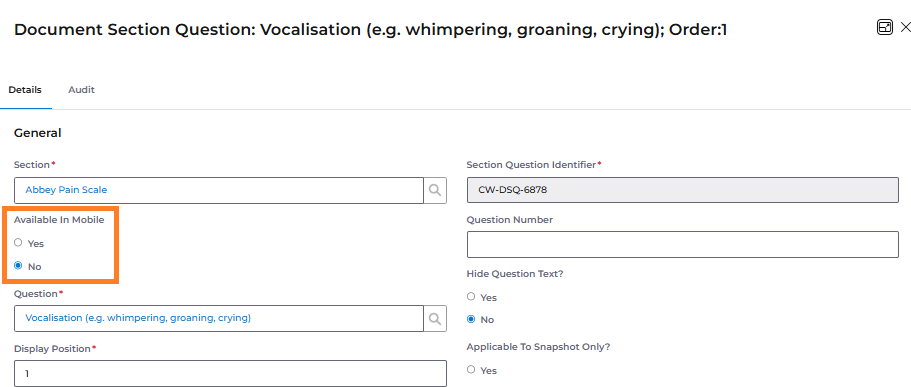 You can also control which Sections and Questions per Section that will show the Mobile App. To do this select the Section or Question and set “Available In Mobile” to ‘Yes’.
