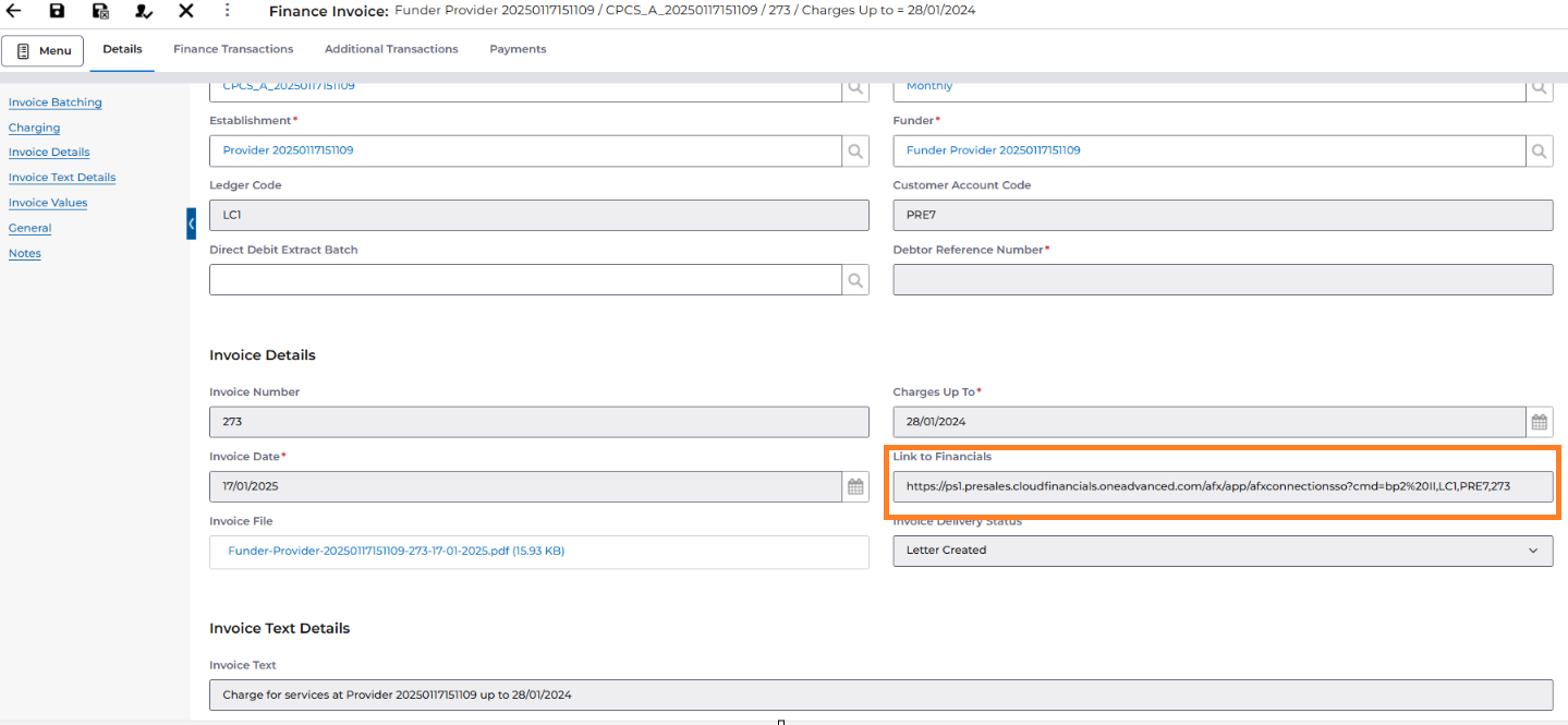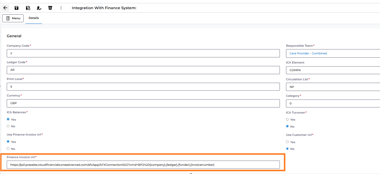 Add the URL for the Advanced Financials system + "{company},{ledger},{funder},{invoicenumber}". In the Example below the URL is "https://ps1.presales.cloudfinancials.oneadvanced.com/afx/app/AFXConnectionSSO?cmd=BP2%20" and so the URL to add is "https://ps1.presales.cloudfinancials.oneadvanced.com/afx/app/AFXConnectionSSO?cmd=BP2%20{company},{ledger},{funder},{invoicenumber}"